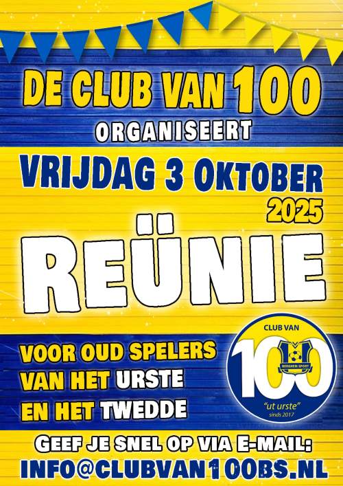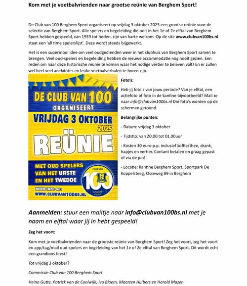 De Club van 100 Berghem Sport organiseert op vrijdag 3 oktober een grootse reünie voor de selectie van Berghem Sport. Alle spelers en begeleiding die ooit in het 1e of 2e elftal van Berghem Sport hebben gespeeld, van 1939 tot heden, zijn van harte welkom. De organisatie heeft een voorlopige lijst, met maar liefst 420 personen, samengesteld van de selectie Berghem Sport all time. Die personen hebben afgelopen week een uitnodiging gekregen via mail, whatsapp, facebook of een brief in de bus.